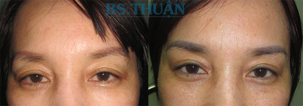 Khách hàng 50 tuổi, 6 tháng sau cắt chân mày xăm hỏng, treo mí mắt dưới chân mày.