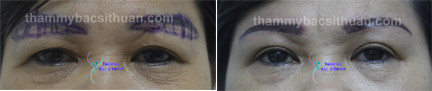 Hình ảnh trước và 3 tháng sau phẫu thuật cắt một phần cung mày xăm hỏng (đã được phun xăm trở lại), sẹo sau phẫu thuật hầu như không được nhận thấy.