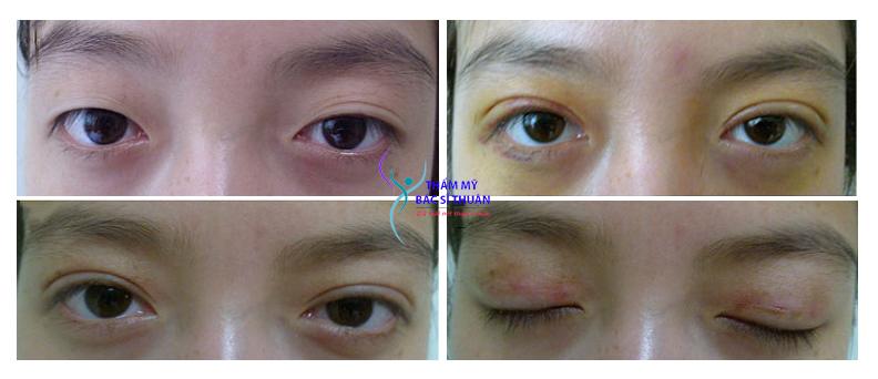Hình ảnh trước phẫu thuật (trên trái), 1 tuần sau phẫu thuật (trên phải) và 3 tuần sau phẫu thuật cắt mắt hai mí với 3 đường mổ nhỏ (dưới).