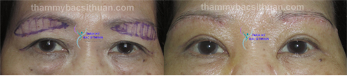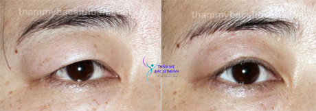 Hình ảnh trước và sau phẫu thuật treo mí mắt trên qua đường mổ dưới chân mày.
